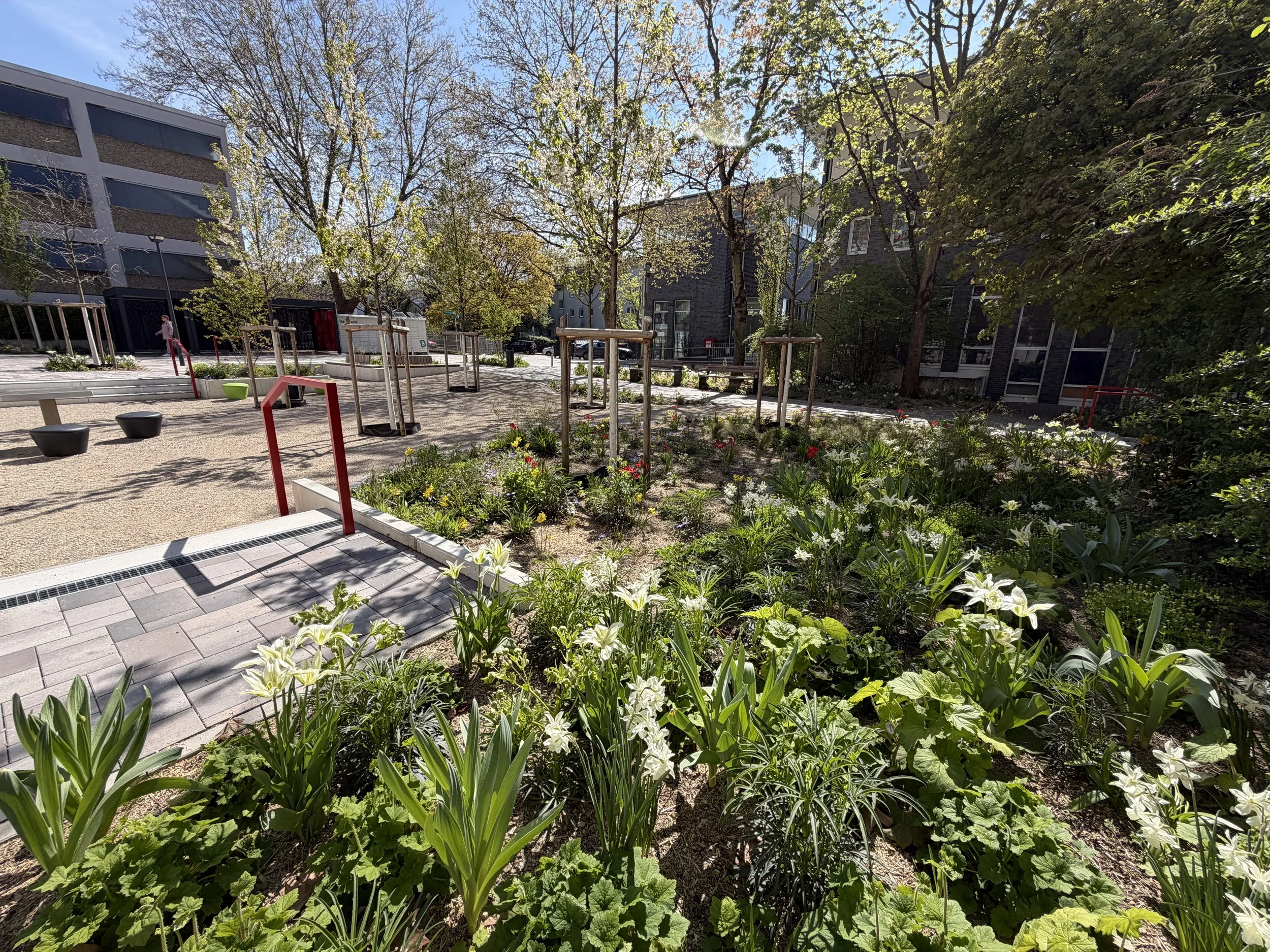 Wir streben an, die von uns geplanten Projekte selbst zu verwirklichen und umzusetzen. Dabei wird versucht, interessante Pflanzungen zu kreieren, wie hier am Ben-Gurion-Ring in Frankfurt mit den beiden nahtlos ineinander übergehenden Staudenmischungen ‘Schattengeflüster’ im Bildvordergrund und ‘Indianersommer’ dahinter. Am 15. April 2026 blühten z. B. Narcissus triandrus ‘Hawera’ (kräftiges gelb) und viele andere Zwiebeln in Weiß- und Cremetönen.