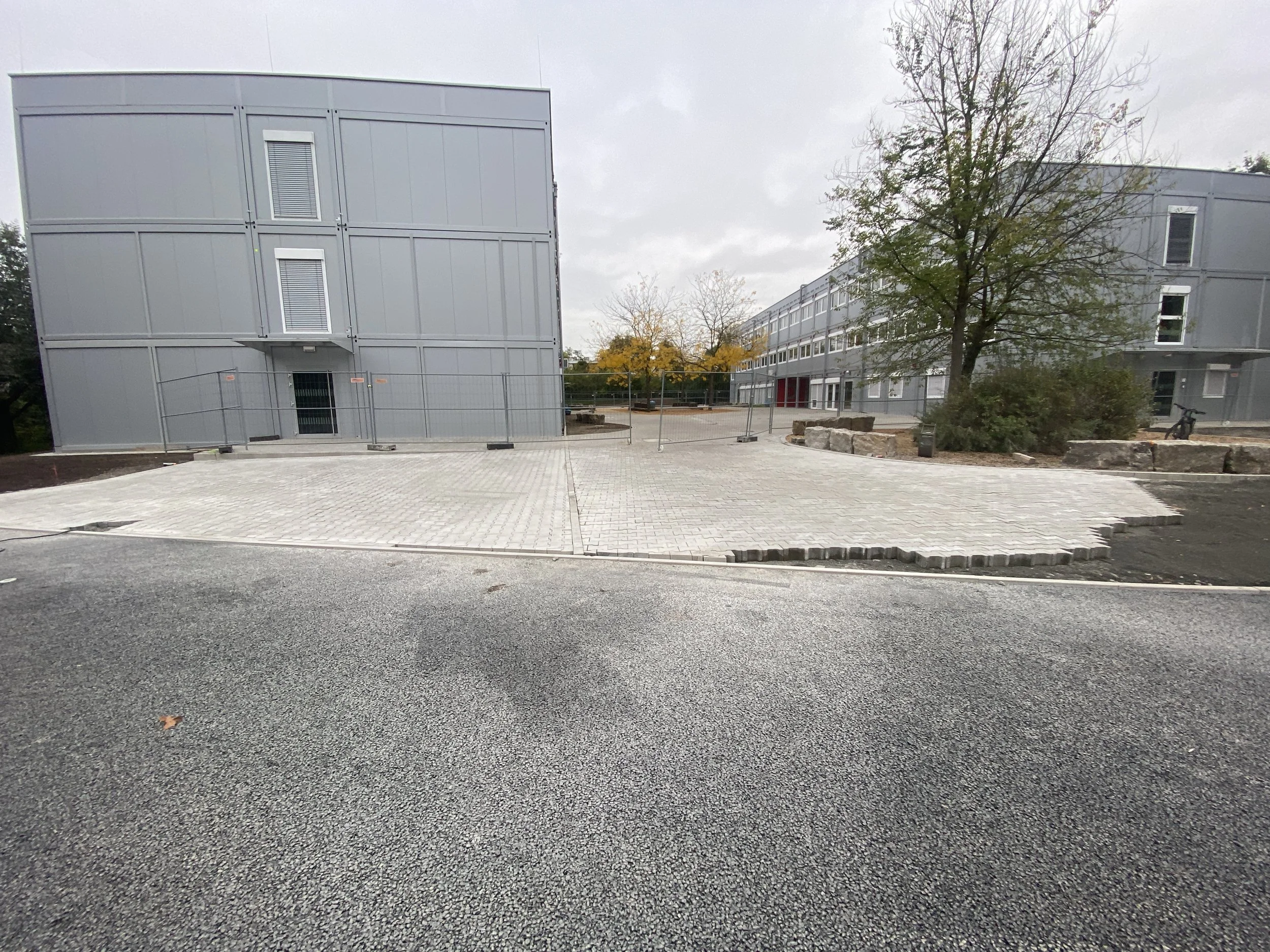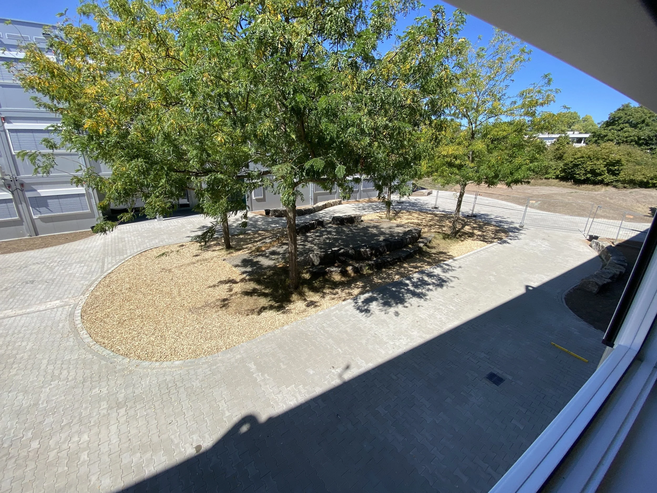 Rund um die beiden neuen Schul-Containeranlagen werden die Außenanlagen neu gestaltet. Dabei werden die vorhandenen Bäume in die Anlage integriert, vor allem die 4 Lederhülsenbäume im Haupt-Schulhof. Es gilt auch, sämtliche Eingänge in die beiden Schul-Ersatzstandorte barrierefrei anzuschließen. Außerdem wird neben den temporären Container-Anlagen ein Dauer-Basketballfeld errichtet, versehen mit einem sog. EPDM-Belag in rot. Nachhaltig ist die Wiederverwendung der ausgebauten Sitzquader, wieder zu Sitzen, nur diesmal im Schulhof.