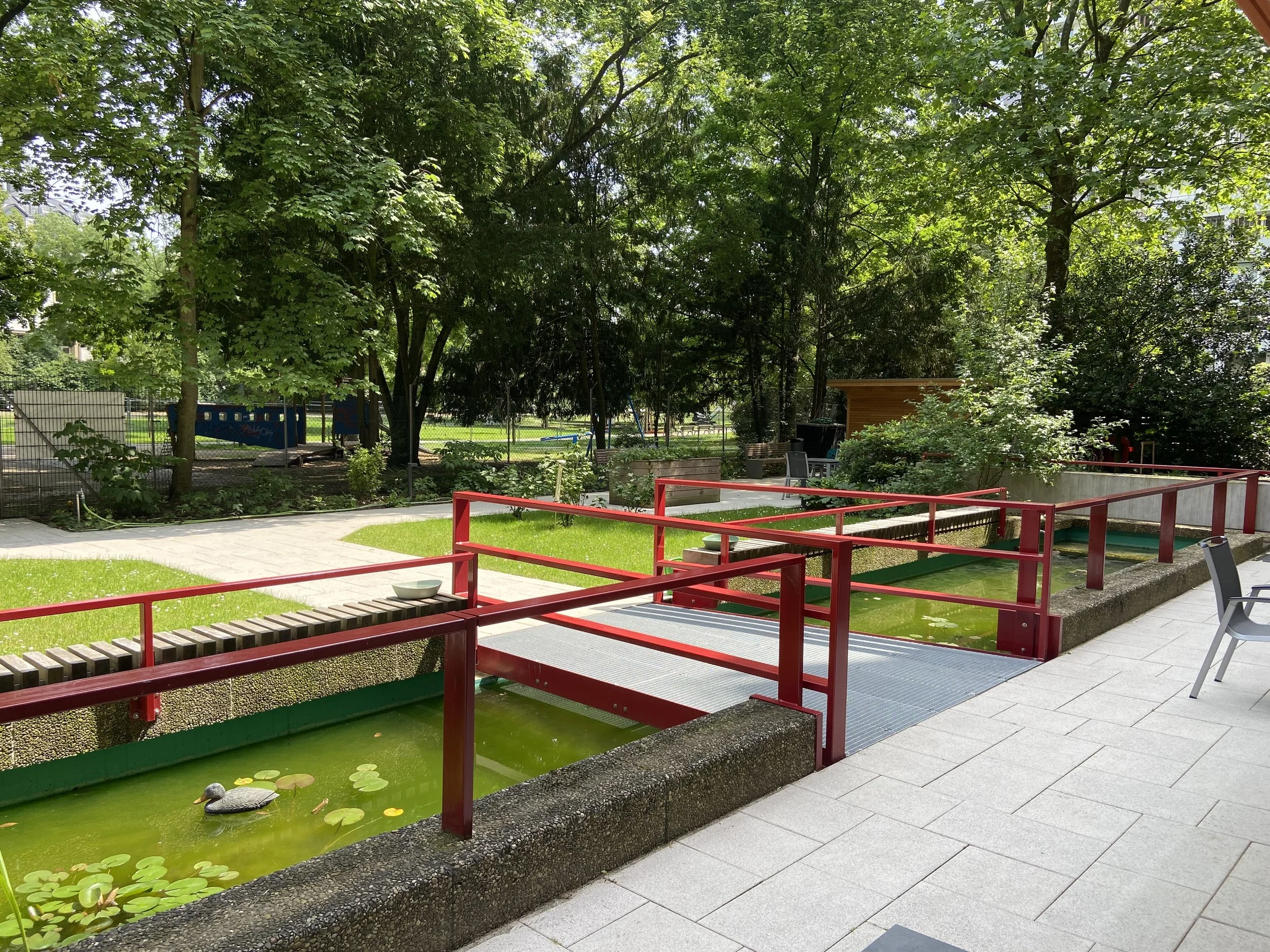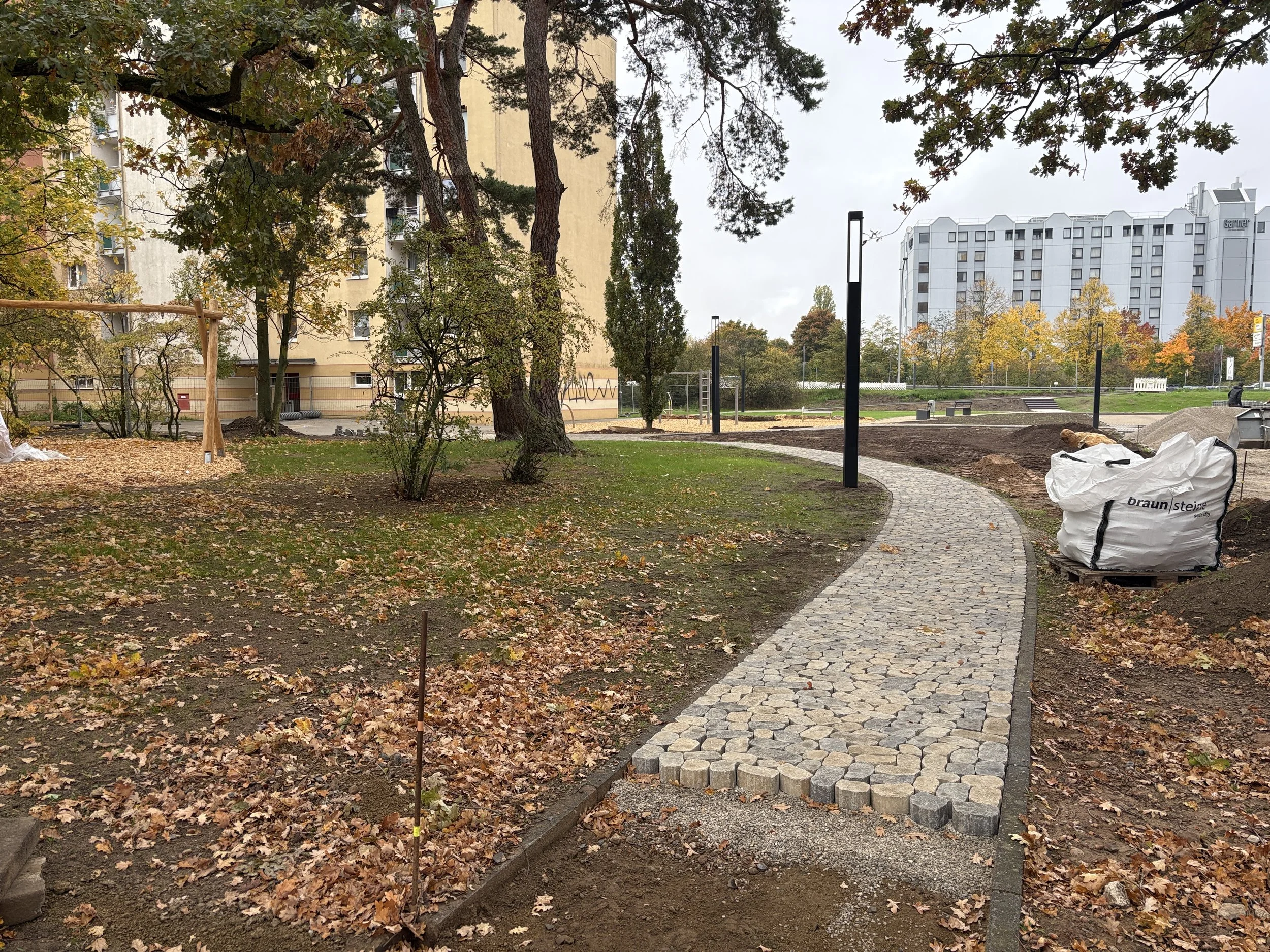 Die Gestaltung von öffentlichen oder privaten Freiräumen gehört zu unseren Kernaufgaben. Wir gestalten auch kompakte Aufgaben, wie hier die radial auf den Gebäudemittelpunkt ausgerichteten Außenanlagen an der Stadthalle in Hattersheim, mit einer Nachbildung der historischen kugelförmigen Leuchten, die nunmehr jedoch nur noch nach unten strahlen dürfen.