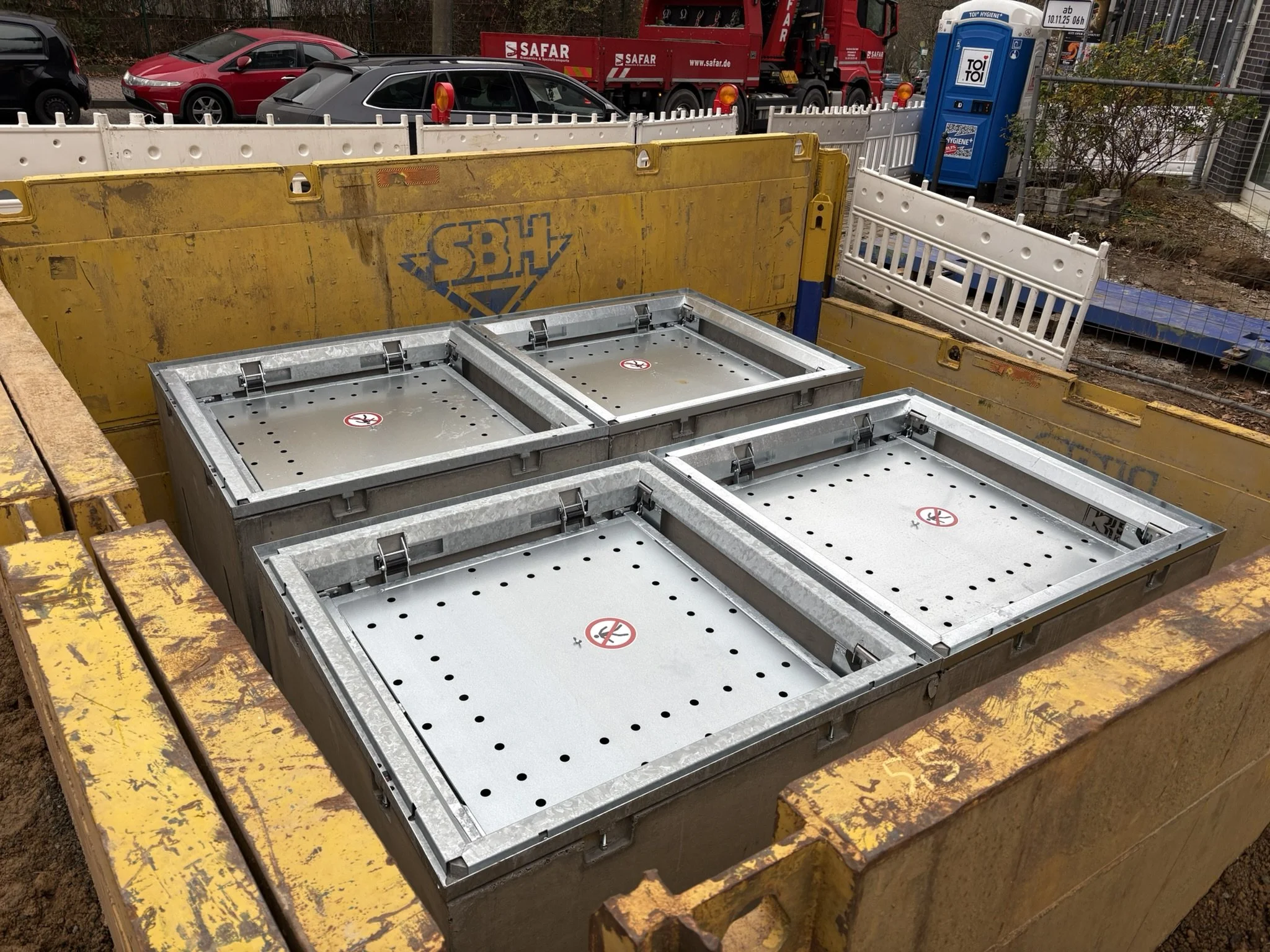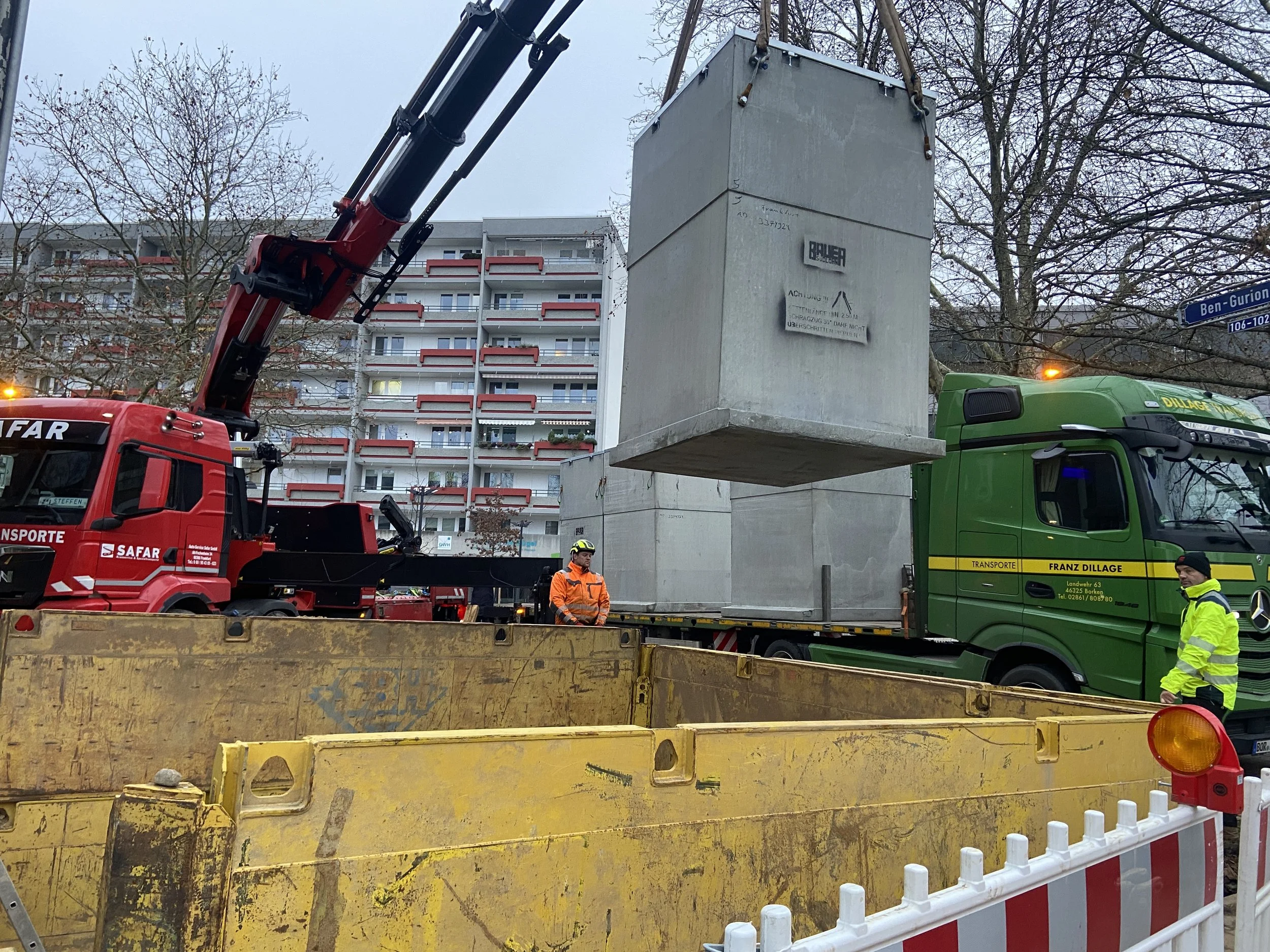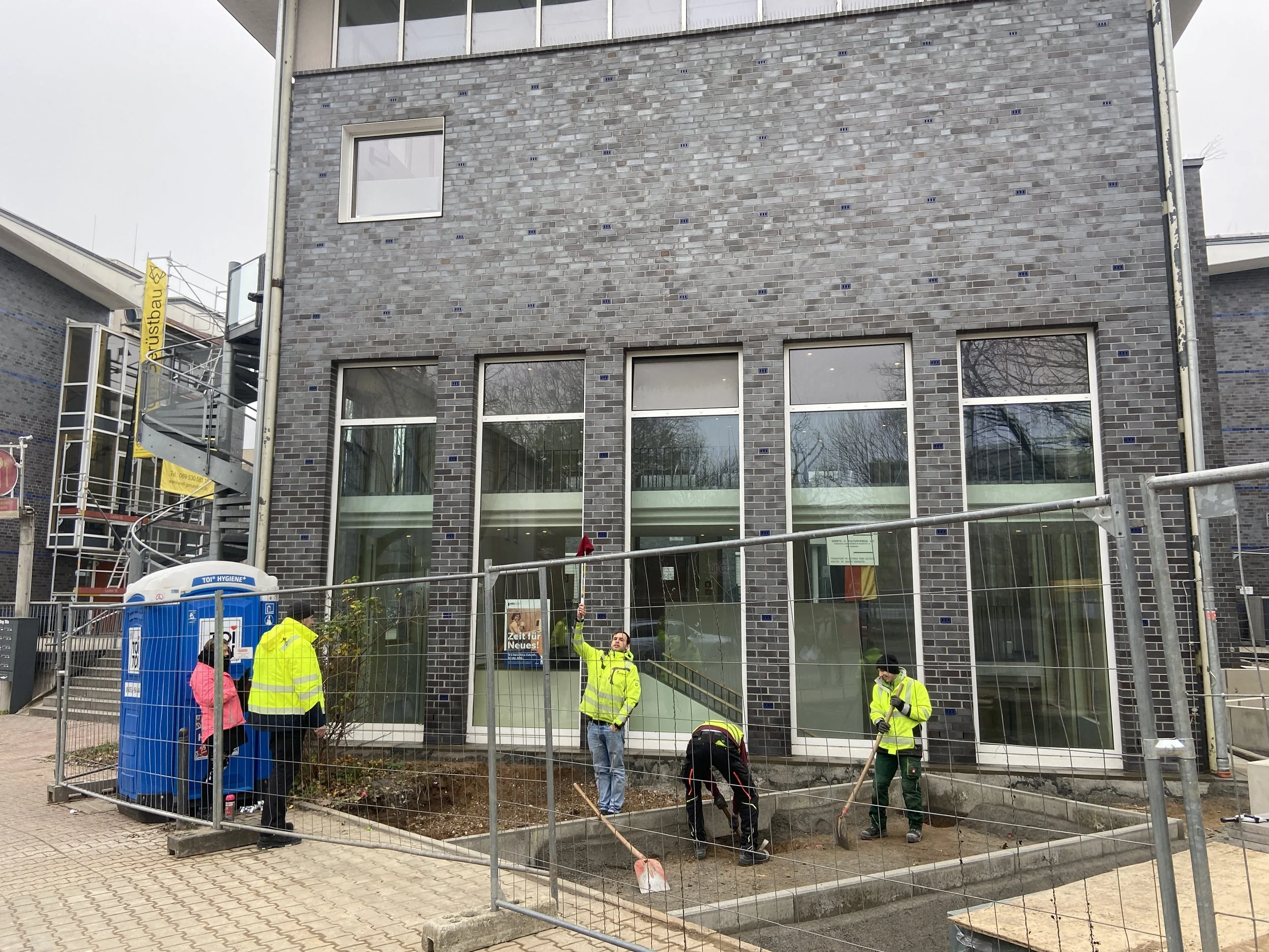 Der Eingangsbereich-Ost am Ben-Gurion-Ring 110a wird auf GWH-Seite nicht nur entsiegelt und begrünt, er bekommt auf dem ABG-Grundstück einen der ersten Unterflur-Müllcontainer für die Stadt Frankfurt. Der alte oberirdische Müllplatz verschwindet und wird ersetzt durch unterirdische Müllboxen für Restmüll, Gelber Sack, Biomüll und Papier. Dies ist logistisch und platzmäßig herausfordernd und bedarf einer guten Kommunikation der vielen Planungsbeteiligten.