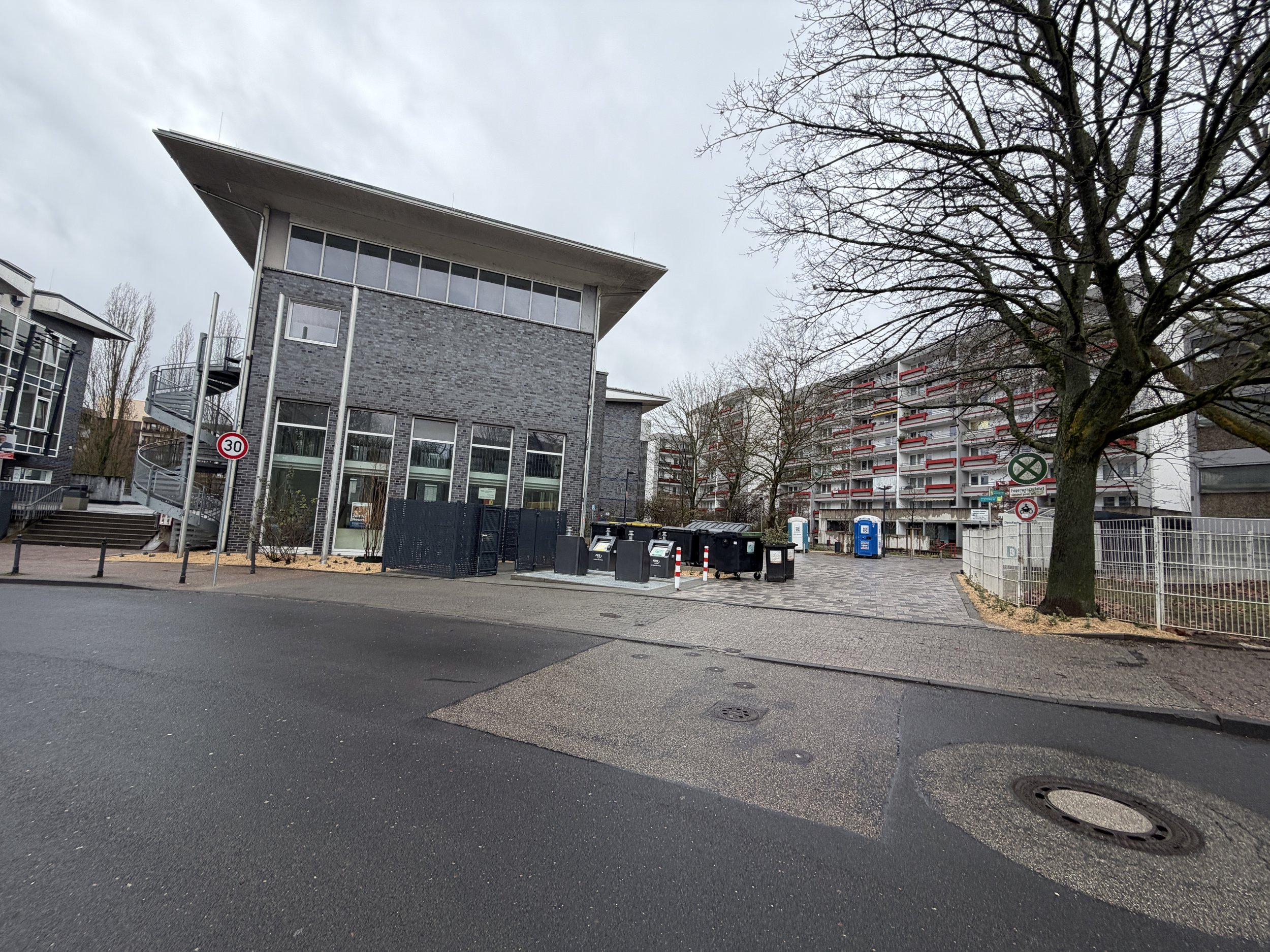 Der Eingangsbereich-Ost am Ben-Gurion-Ring 110a wird auf GWH-Seite nicht nur entsiegelt und begrünt, er bekommt auf dem ABG-Grundstück einen der ersten Unterflur-Müllcontainer für die Stadt Frankfurt. Der alte oberirdische Müllplatz verschwindet und wird ersetzt durch unterirdische Müllboxen für Restmüll, Gelber Sack, Biomüll und Papier. Dies ist logistisch und platzmäßig herausfordernd und bedarf einer guten Kommunikation der vielen Planungsbeteiligten.